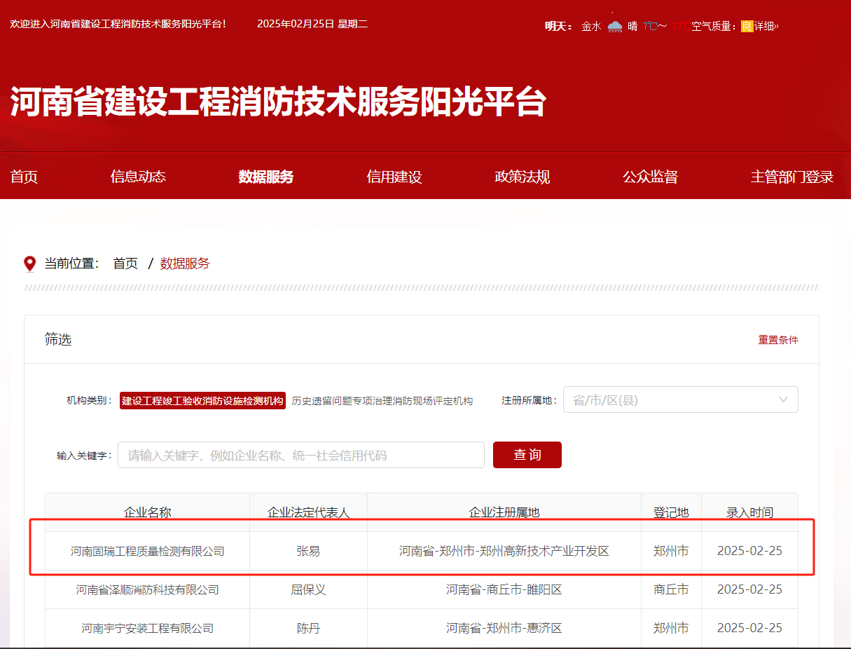 熱烈祝賀河南固瑞工程質(zhì)量檢測有限公司入冊河南省建設工程消防技術服務陽光平臺!!!